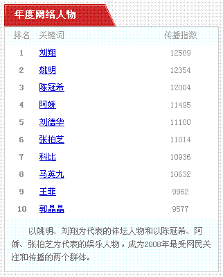 受到北京舉辦奧運(yùn)會(huì)的影響和“艷照門”事件的炒作,以姚明、劉翔為代表的體壇人物和以陳冠希、阿嬌、張柏芝為代表的娛樂(lè)人物,成為最受關(guān)注和傳播的兩類公眾人物。科比、貝克漢姆和菲爾普斯為十份榜單中僅有的三名外籍人士,科比還同時(shí)入選年度網(wǎng)絡(luò)人物和年度體壇人物的十強(qiáng)。在年度企業(yè)家榜單中,以王石、黃光裕、牛根生等為代表的爭(zhēng)議性人物和以丁磊、馬云為代表的商業(yè)模式英雄,成為最受關(guān)注和傳播的兩類企業(yè)家。