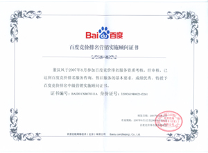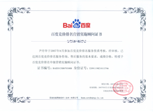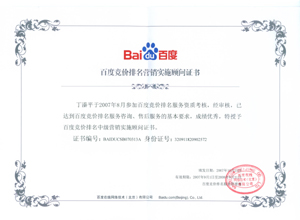 鹽城思科網(wǎng)絡工程有限公司作為百度鹽城地區(qū)總分銷商,在2007年度參加百度競價排名服務資質(zhì)考核中,經(jīng)過公司全體員工們的共同努力,再創(chuàng)佳績,其中通過中級服務認證考核8人,3人優(yōu)秀,通過率達95%,被全球最大中文搜索引擎——百度在線(北京)有限公司再次授權(quán)百度競價排名鹽城地區(qū)唯一客戶服務中心。盡善盡美的售后、全心全意的服務,思科人將用十二分的熱忱等待您的惠顧,共創(chuàng)新紀元!
