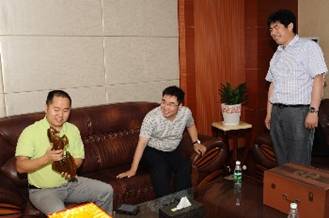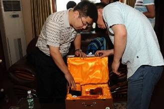 百度領(lǐng)導(dǎo)帶來(lái)的寓意深遠(yuǎn)的精美禮品在贈(zèng)送儀式開(kāi)始之前,鞏總、金總認(rèn)真查看禮品
